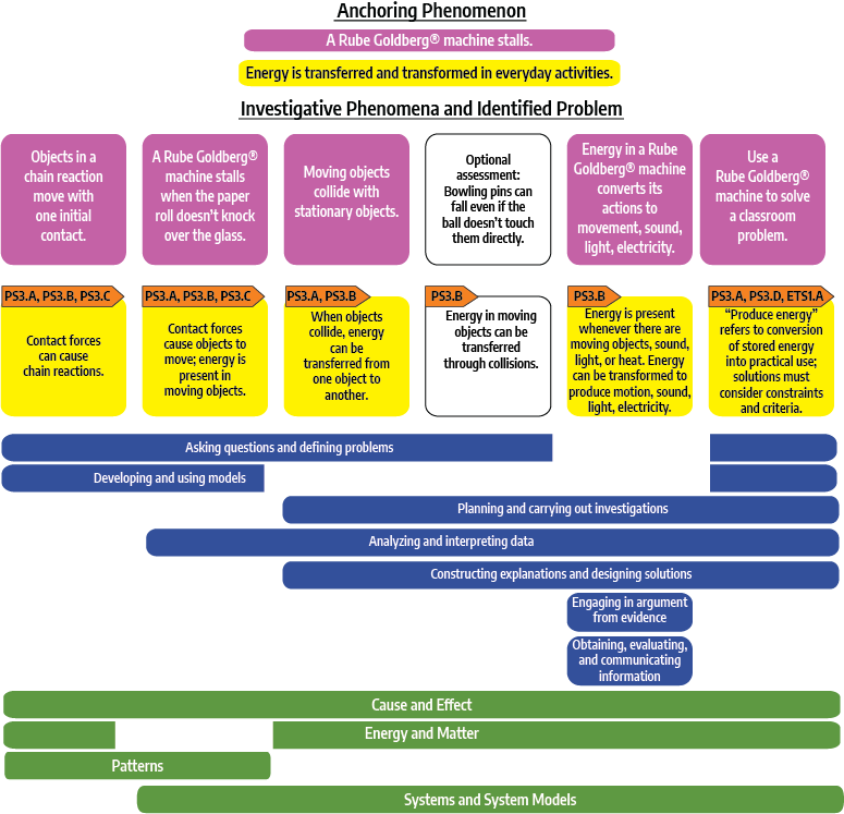 The investigative phenomena for the learning sequence are various Rube Goldberg® machines in which objects move. Students figure out these phenomena by: