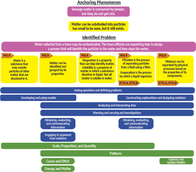This engineering design learning sequence is built on the anchoring phenomenon: Sewage water is consumed by people, but they do not get sick. Students are introduced to water samples that have been gathered from a local town. The town hires the students to find out what is in the water and tell the town how to clean it. Students explore matter and its properties and discover that matter can be identified and grouped by its properties. Properties include size, shape, color, magnetism, conductivity, and solubility. They investigate quantifying matter by weight and volume. Using their understanding of physical properties, students design a solution, including a filtration system, to determine what is in the town water samples.