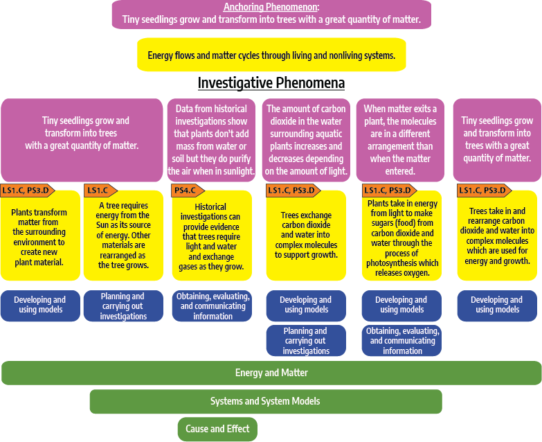 This unit builds around the idea that energy flows and matter cycles through living systems. The anchoring phenomenon for the unit is a time-lapse animated video of a seedling growing into a tree. This phenomenon leads students to ask, “Where does it come from?” Students investigate the energy flow and matter cycling in a seedling as it gathers matter through chemical reactions to grow into a large oak tree.