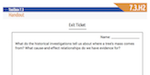 7.3.H2: Exit Ticket is answered individually by each student. The exit tickets should be reviewed and returned to the individual students with your evaluation using the 7.3.H3: Exit Ticket Assessment Rubric. Mark each row of the rubric with yes/no to provide feedback to each student. As you have judged each students work, put a tally in the yes or no column of 7.3.R1: Exit Ticket Assessment Rubric: Possible Instructional Responses to identify trends across the entire class. Suggestions located in the last column of 7.3.R1: Exit Ticket Assessment Rubric: Possible Instructional Responses may be used to support individual students as well as used with the entire class.