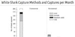 For differentiation, consider the figures you give to students when jigsawing. For example, 8.9.G3: White Shark Capture Methods and Captures per Month may be more approachable to students, as a bar-style graph tends to be familiar; 8.9.G1: Locations of White Shark Captures in Southern California by Age Class and 8.9.G2: White Shark Captures by Season in Southern California are a bit more sophisticated (due to their map coding perspective) but still accessible to most students using the I2 strategy. The figures shown on 8.9.G4: YOY White Shark Captures Before and After Nearshore-Gillnet Ban are good for students who would benefit from interpreting a figure that is more challenging, as each represents multiple types of information in one figure.