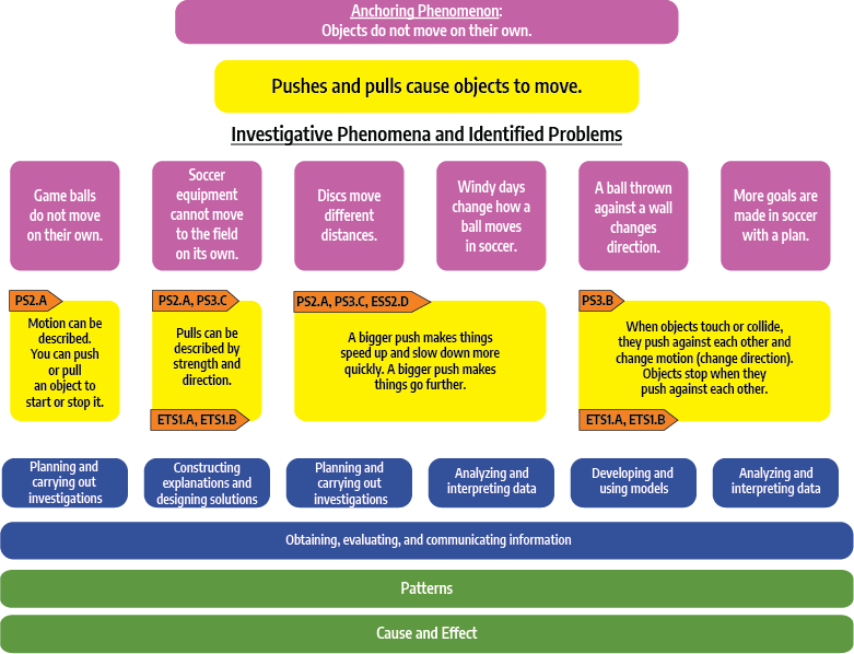 The concepts of cause and effect related to pushes and pulls contributes to the understanding of the anchoring phenomenon of how pushes and pulls are used to move motionless objects such as soccer equipment to the field.