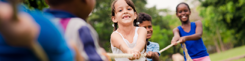 Small children on the playground win a tug-of-war challenge against a group of bigger children.