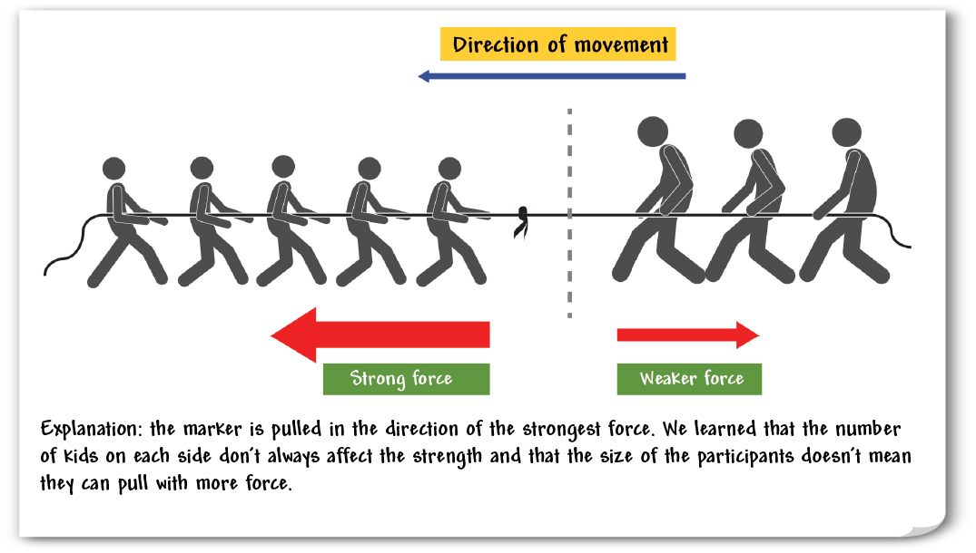 Sample Directions for Challenge B (draw)Decide how to make the forces equal on both sides of the rope. Let students know that they can experiment two times, and then they must decide who is on what side. ESRs: I know that I can use patterns to predict future motion, so if I try my ideas, I can see the pattern that works best.